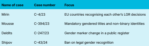 Rights within the EU apply to all EU citizens and residents, including trans people. Between 2024 and 2025, the CJEU made several important rulings that strengthened protections in sensitive areas for trans people. These rulings are the result of years of hard work by trans activists, civil society organisations, and legal teams. They show how EU countries must protect trans people’s rights. They apply to courts, public authorities, private and public bodies that collect personal data, and other institutions that affect trans people’s daily lives.